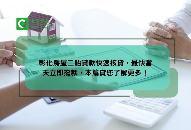 辦理合庫彰化房屋二胎貸款,從提出申請到最後撥發款項,最快當天就能完成,讓借款人能及時運用資金,迅速化解借款人的燃眉之急。